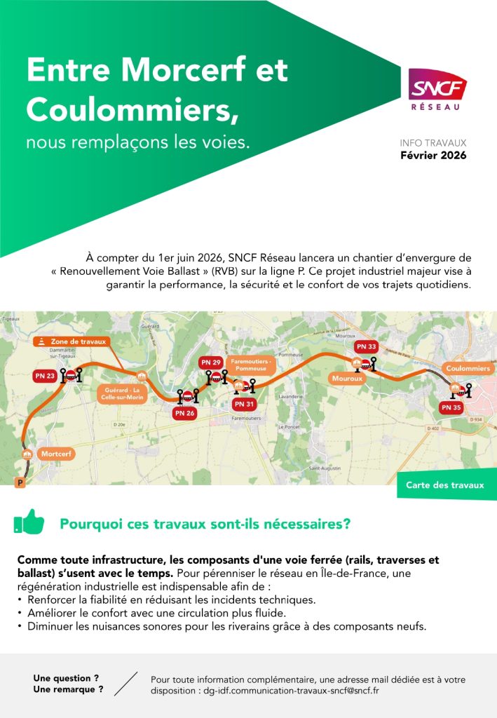 À compter du 1er juin 2026, SNCF Réseau engagera un chantier majeur de “Renouvellement Voie Ballast” (RVB) sur la ligne P, entre Coulommiers et Mortcerf.