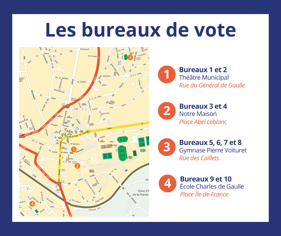 - Bureaux 9 et 10 : École Charles de Gaulle – Accès Place Île de France ou parking du docteur Lorimy